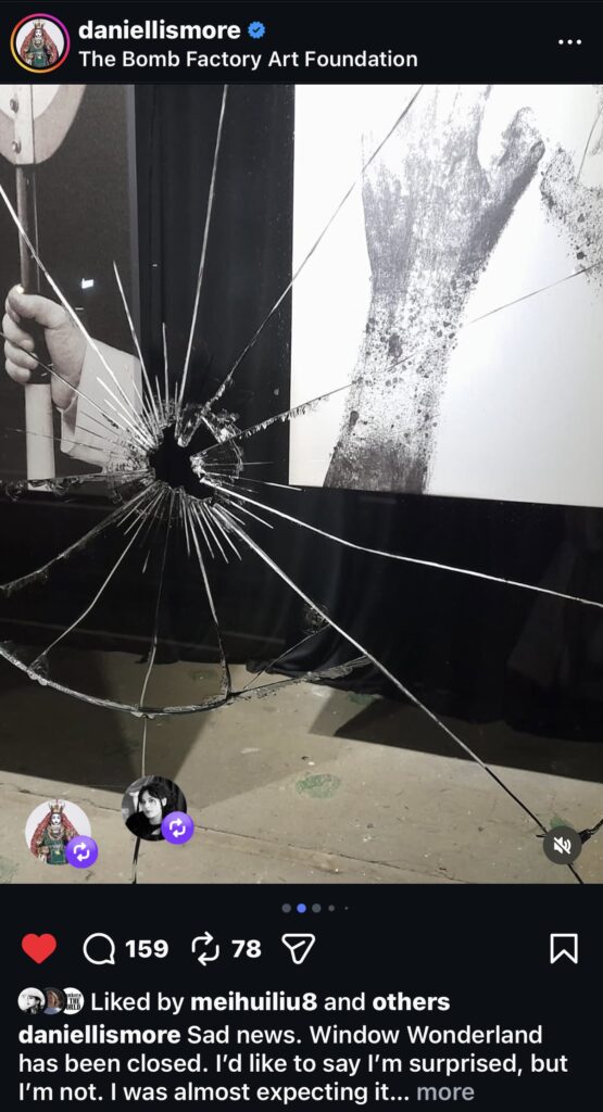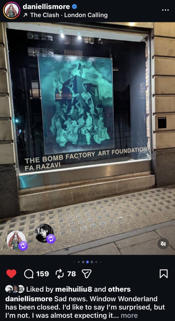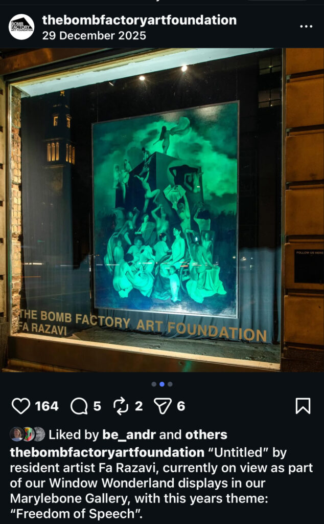 Continuing from my above reflections on the THE LONG NOW exhibition and reacting to what happened to my fellow artists FA RAZAVI and PETER KENNARD, who exhibited their works as The Bomb Factory Art Foundation’s Window WOnderland at their Marylebone Gallery a response to this year’s theme “Freedom of Speech”. These people chose to not sit quietly and observe or to “distract from the nihilism and the hate” by painting “optimistically, like ice cream” . They very bravely chose to bring people’s attention to difficult inequalities happening in the world today. I admire them. But that comes with consequences. The exhibition was vandalised: windows broken with ice hammers and artworks spat on. It had to close on the 9.01.26, nine days before the official closing date. I am feeling a mix of things: empathy for my fellow artist, disgust and anger towards the primitive brains of vandals, who can’t see beyond their own hate of the collective “enemy”, a bit of envy towards the artists as I believe this type of situation only makes their art stronger and more visible, as well as my own fear and thinking: would I be brave enough to express my opinion through my art so honestly? Or do I prefer to stick to what I know best, mother’s life experiences, which might resonate with some people but are also not specifically directed towards someone in particular? Another question: How can my work help Iranian women? How can I ignore what is happening to them?