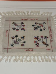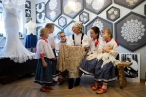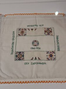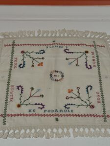 In the early 20th century, a fashion developed in the Opozno region for embroidered handkerchiefs trimmed with crochet as an important element of courtship. In addition to decorative patterns, they were embroidered with sentiments about love and fidelity, along with the dates and lovers’ names or initials. These “flirtatious” handkerchiefs were introduced by a young generation of village women who now knew how to write. As girls, they also learned crochet and some embroidery techniques at school rather than at home. Maidens embroidered parade handkerchiefs for their chosen swains, and delivering the handkerchief confirmed their feelings. This custom is echoed to this day in the play of preschoolers accompanied by a song about an “embroidered handkerchief.”