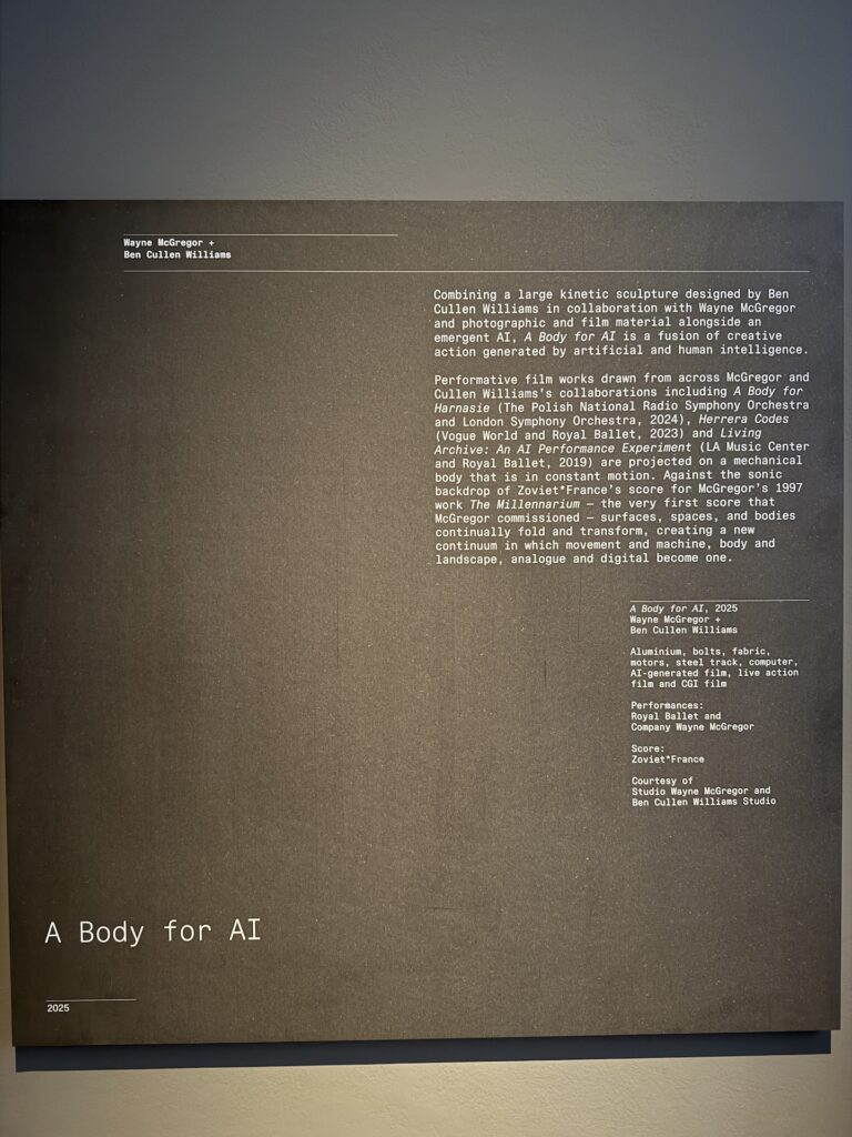 Another piece that truly resonated was the last one, a giant 5m x 10m robotic construction, with rectangukar planes moving up and down as well rotating and folding, with projections of nature such as fields or water as well as extreme close-ups of a male dancers body projected onto it, very monumental. I also noticed how cables were distributed on a giant scaffolding and wondered: how much did building of something like this cost? It was called A Body for AI, a kinetic sculpture designed by Ben Cullen WIlliams in collaboration with Wayne McGregor, a fusion of creative action generated by artificial and human intelligence.