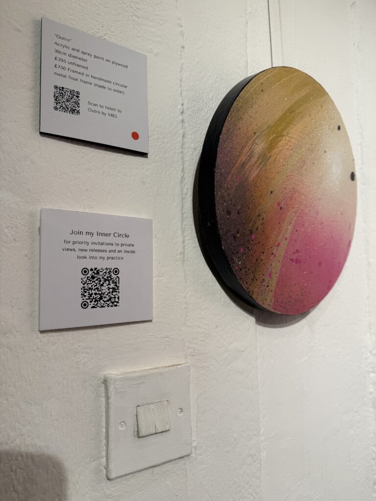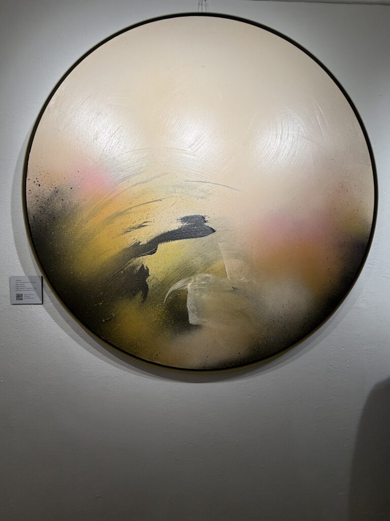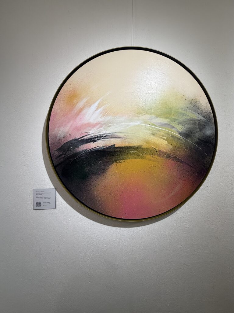 KATE MYER AND FRANKIE BOYLE EXHIBITION: Kate is a London-based contemporary abstract artist who creates circular forms with airbrush and acrylic. Kate calls herself “a lifelong feeler of the world. My work is a response to sound and sensation. I’m considered a highly sensitive person, and I suspect I experience a form of synesthesia — when I hear music or feel energy, colour choices become completely intuitive, as if the painting is a visual translation of vibration itself. Often on circular forms, my work aims to reflect not just how life looks, but how it feels”