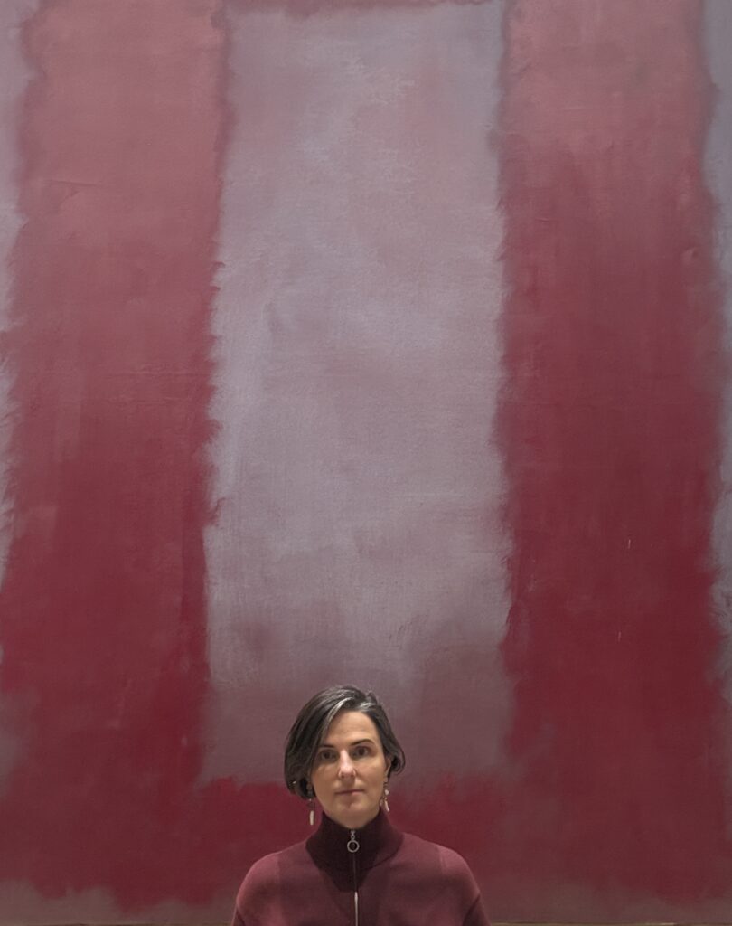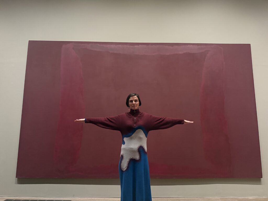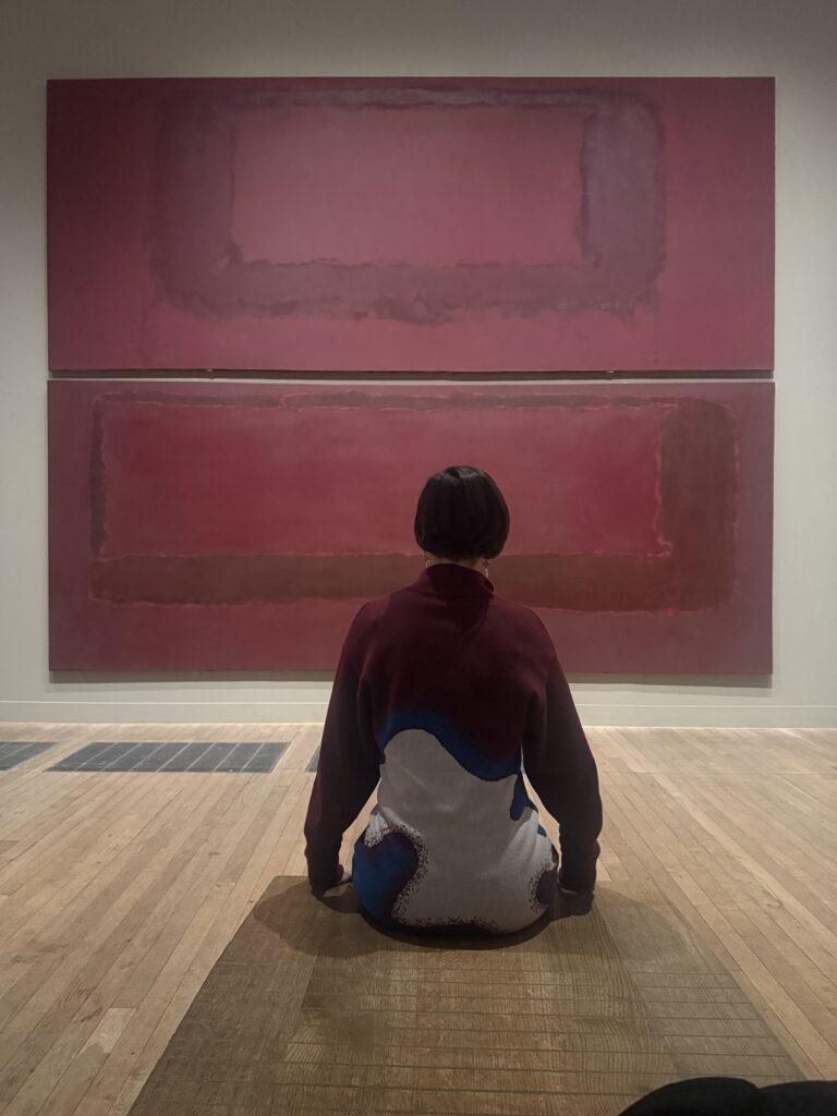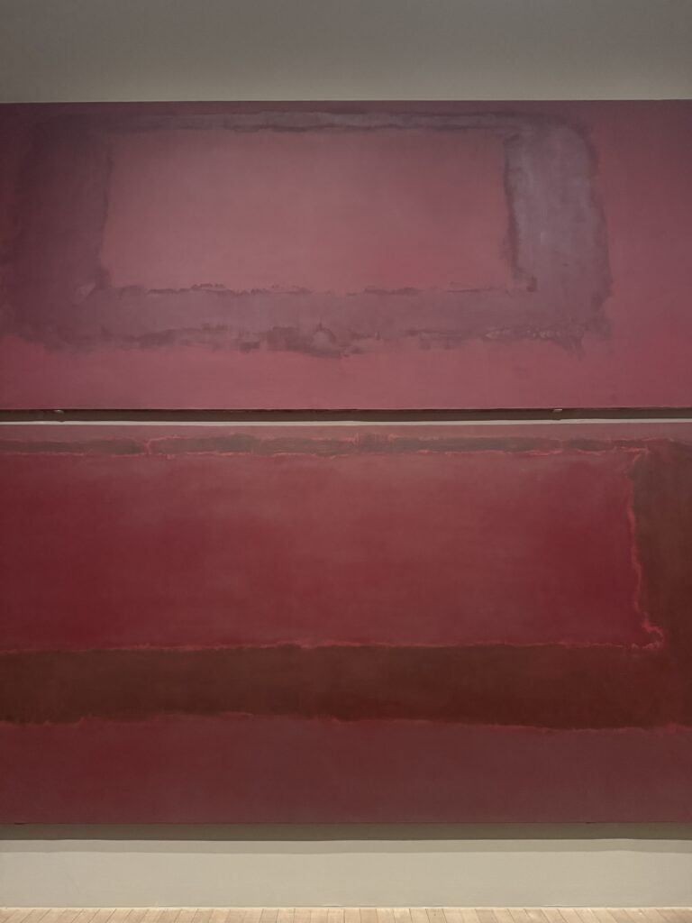 I went in not really knowing what to expect and I have a feeling I should have gone by myself rather than with a friend. We ended up interacting with the pieces and taking photographs posing because the colours of our clothes matched the paintings. There were other people there sitting quietly, sketching, writing, and I worried we looked like we didn’t take them seriously. Were we MOCKING? At the same time I wondered, is that what Rothko would have wanted? Serious and quiet meditation? Was that the purpose of the works? Or is it for everyone to feel what they want to feel? I did think it was the overwhelming monumentality of them that resonated with me. It made me want to add at least two times more fridges to my MAMADRAMA(or MOTHERCORE), which I decided to rename after realising that Rothko called his own paintings “dramas” and that truly resonates with the drama happening inside my overwhelmed mother mind when painting my abstracts on the fridge doors. But I feel I want to go back when I’m more depressed and check how differently looking at them might feel