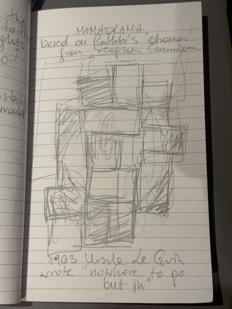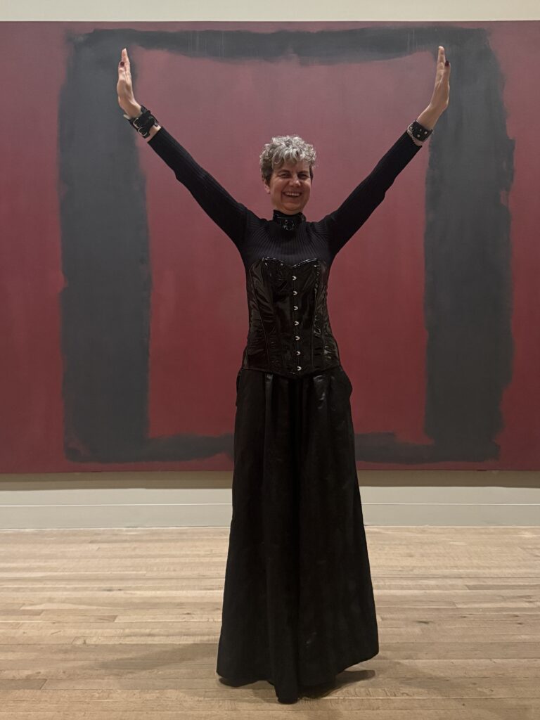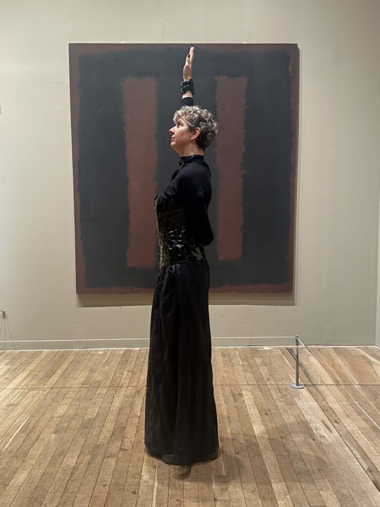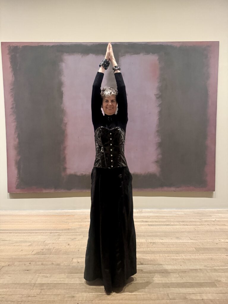 I went in not really knowing what to expect and I have a feeling I should have gone by myself rather than with a friend. We ended up interacting with the pieces and taking photographs posing because the colours of our clothes matched the paintings. There were other people there sitting quietly, sketching, writing, and I worried we looked like we didn’t take them seriously. Were we MOCKING? At the same time I wondered, is that what Rothko would have wanted? Serious and quiet meditation? Was that the purpose of the works? Or is it for everyone to feel what they want to feel? I did think it was the overwhelming monumentality of them that resonated with me. It made me want to add at least two times more fridges to my MAMADRAMA(or MOTHERCORE), which I decided to rename after realising that Rothko called his own paintings “dramas” and that truly resonates with the drama happening inside my overwhelmed mother mind when painting my abstracts on the fridge doors. But I feel I want to go back when I’m more depressed and check how differently looking at them might feel