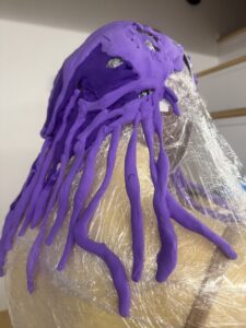 How are we going to paint it to make sure it matches the base bodysuit?! My knowledge of colour helped, we used purple clay as base because there are a lot of purple veiny elements in the jumpsuit. We then painted sickly burnt sienna poster paint mixed with pale pink as well as metallic copper acrylic paint and a experimented with layer of purple metallic facepaint, which ended up looking fantastic and really blending in