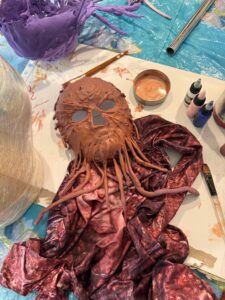 What are we going to use?! – bought jumpsuit combined with paper mask, aidry clay, gluegun veins(my son’s idea), burnt sienna poster paint mixed with pale pink as well as metallic copper acrylic paint and a layer of purple metallic facepaint