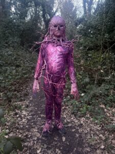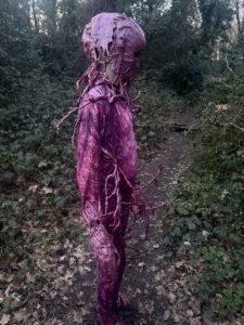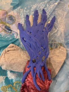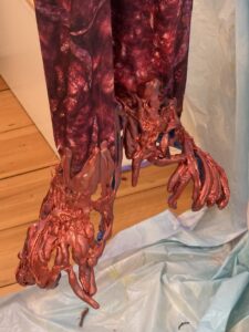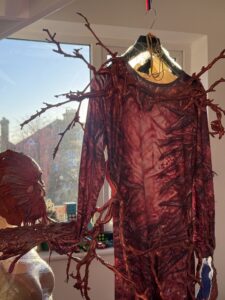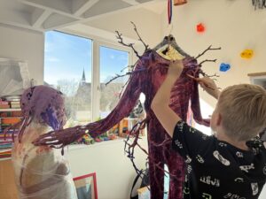 How are we going to attach it to the jumpsuit?! We ended up sewing the branches by hand onto the jumpsuit, then rolling the clay in our hands and wrapping it around the branches that were touching the body. When making the hands and feet we only used clay as the great thing about this clay is that it actually sticks really well to synthetic lycra fabrics when drying. Julian added some great veins to hands and feet using glue from the gluegun. Overall I would call Vecna’s Curse a successfull family art project, fuelled with love and passion for making and a need to create things together, which is part of my practice and therefore a not-feeling-guilty reason I will be showing less lamps than planned during the interim show