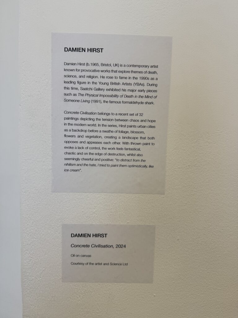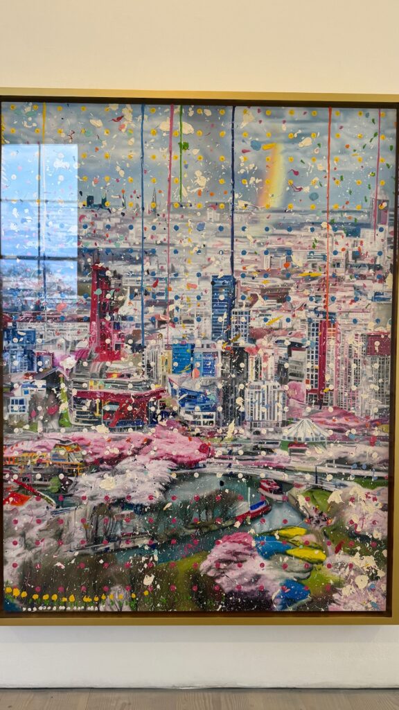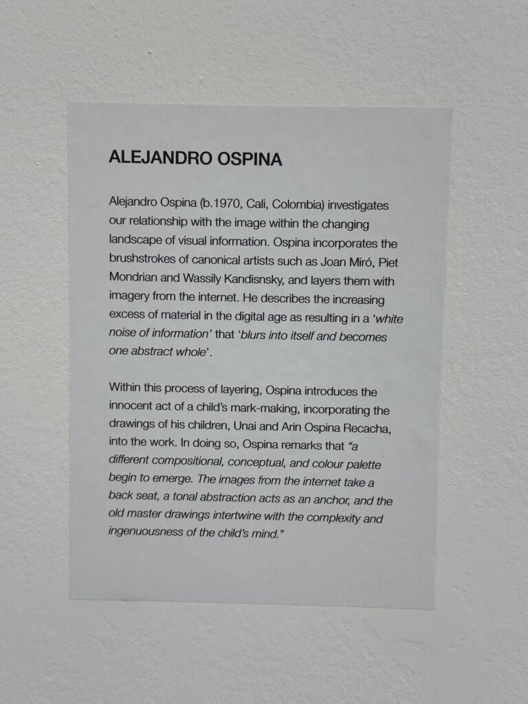 Funnily enough, as soon as I saw Alejandro Ospina’s paintings, I felt a rush of excitement to see the work of a friend and neighbor from my studio space. As I met him right before Christmas during open studios, I passed him multiple times in the studios corridor. I got to see his beautifully lit massive studio and heard the story of the projector and how he projects his kids drawings onto his paintings. And what surprise and joy and pride I felt when seeing his works at Saatchi!!! Bravo Alejandro. I feel uplifted and relaxed by the works of Damien Hirst and Alejandro Ospina, they’re pleasant to watch. Hirst’s idea to mix urban cities with flowers and vegetation in order to “distract from the nihilism and the hate” by painting “optimistically, like ice cream” and Ospina’s layering of Miro, Mondrian and Kandinsky with imagery from the internet and incorporation of drawings by his children to introduce “innocent act of a child’s mark-making” are all great ideas but for some reason to me personally they lack the emotional weight and depth. I am unable to connect these to my own inner turmoil and I see them as “designed” and caltulated rather than motivated by true internal struggle and reaction to what is happening in the world. I feel both of them are looking for admirers rather than people, who will think: I connect with this piece on a deeper level. I myself feel torn when it comes to choosing my path: do I want to/have the courage to take feminist and political route, following the situation in the world and reacting to it through my work, or do I want to remain slightly ignorant and detached and focus on calculated exploration of a particular style or technique? And another question: how much apocalyptic news and immersion into the heaviest subjects am I able to handle before becoming depressed?
