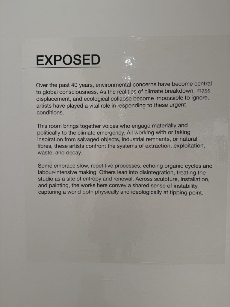 I’m feeling inspired by so many unbelievably amazing pieces from this exhibition!!! Starting with the monumental pieces, which I saw at the end but somehow they got stuck in my head the most: Richard Wilson’s 20:50, which was originally created in 1987 but it is still, or probably even more so now, incredibly relevant, not just the daunting blacker than black depth of the surface but what affected me the most was the smell, which I could sense as soon as I entered the space 2 rooms ahead of the 20:50 room and could immmediately smell what felt like I was on a street in Bangkok during the worst smog. I mean the smell was so strong, I immediately thought someone spread it there on purpose, not realising it was coming from the 20:50 oil. Another thing about this piece were the dripping lines of oil, which were probably coming from the top of the surface moving slightly but I immediately felt scared that the screws are loosening and the iron walls are about to burst and the hectoliters of oil will now spill and cover everything in the Gallery. Apocalyptic.