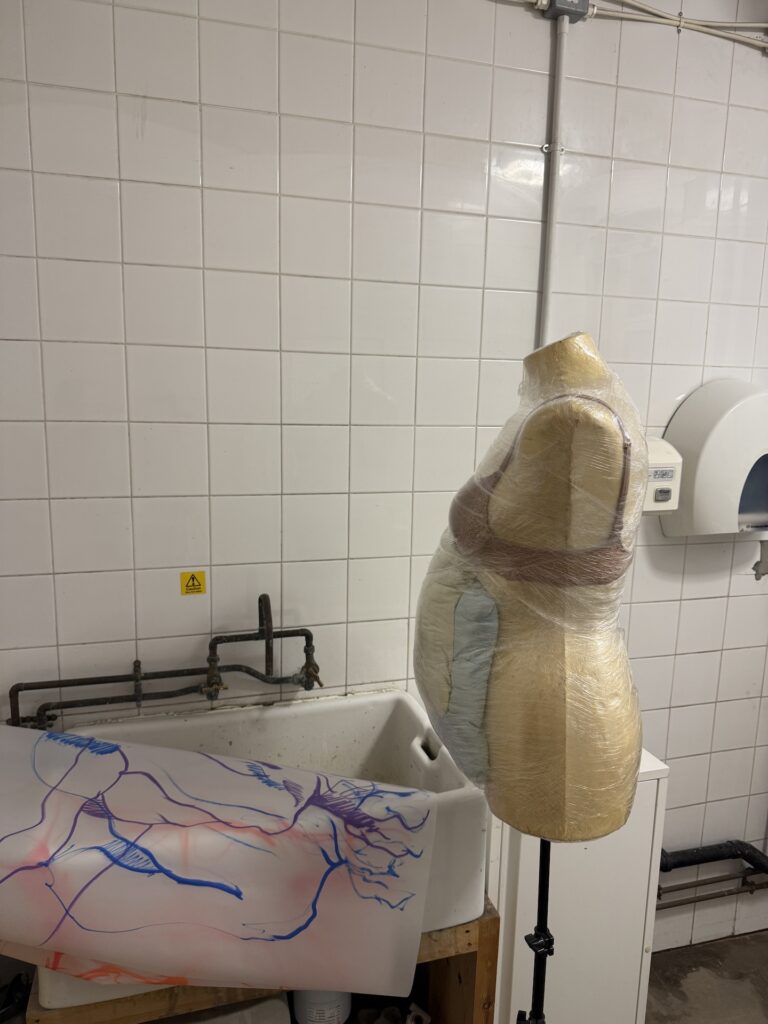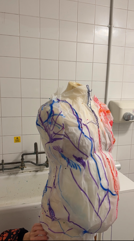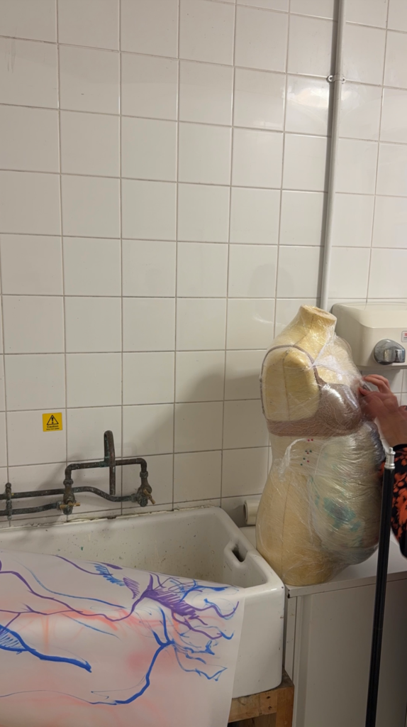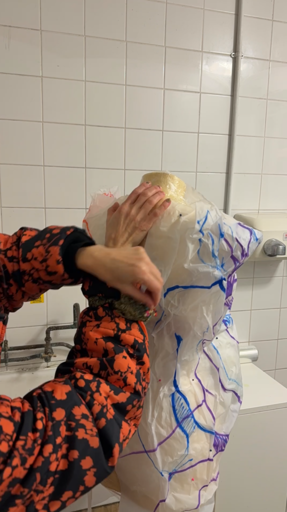 The positive: while playing around with AI making the final image proposal for Window Wonderland I came up with pregnant/postpartum bellies versioin of my initially round paper lamp. I thought about how I could make that. I decided to find a mannequin from my fashion times buried deeply in the attic, attach a “belly” using two small pillows and wrap the entire thing in cling foil to keep the whole shape together so that the wet drying technical wouldn’t stick to them. I then placed the wet paper on the mannequin and squeezed and squashed and folded it while also pinning it in various places to make sure it dried keeping the desired shape. I was also very happy with the improvement I made from previous lamp experience: I stitched two papers with each other beforehand so could manouvre them much easier together when attaching to form as one giant piece of paper. Also, I love the effect of the stitching in the CFR of the form, it reminds me of caesarian section stitches after giving birth to my son and another stitching experience from the time I was giving birth to my two daughter. Overall quite happy with the final result and the use of stitching and pins, which really helped. Now worried how to make it hang nicely and how to attach it to cables with lightbulbs